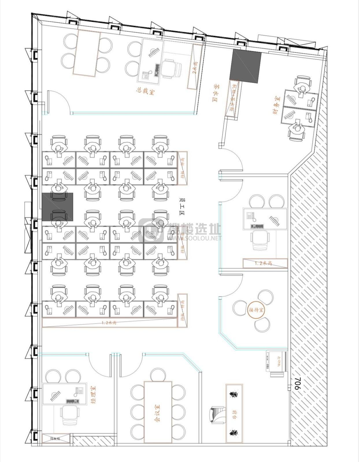 - 面积信息 298㎡,使用率约70% ,可容纳工位30~43个